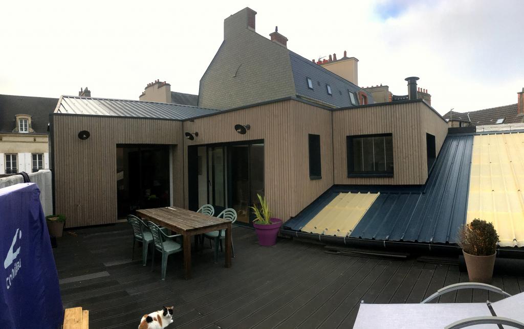 Bardage : Werzalit Gris foncé ; Eveils : tôle Aluminium Gris Anthracite
